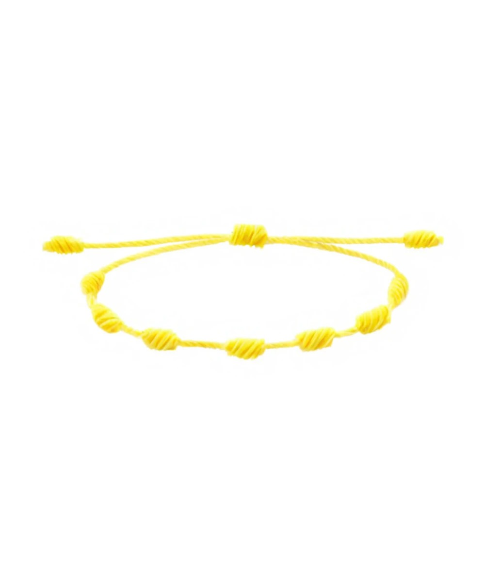 Pulsera de los 7 nudos en color amarillo. Utilízala en tu mano izquierda como amuleto de la buena suerte y como pulsera de protección contra malas energías y el mal de ojo. Como regalo espiritual se dice que estrecha lazos afectivos. Puedes usarla sin adornos o bien colocar un colgante para rematarla.