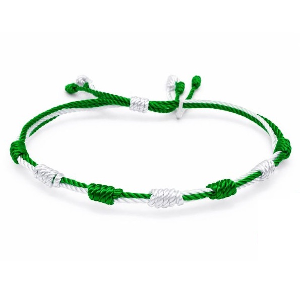 Pulsera de los 7 nudos en los tonos de la bandera de andalucía. Utilízala en tu mano izquierda como amuleto de la buena suerte y como pulsera de protección contra malas energías y el mal de ojo. Como regalo espiritual se dice que estrecha lazos afectivos. Puedes usarla sin adornos o bien colocar un colgante para rematarla.