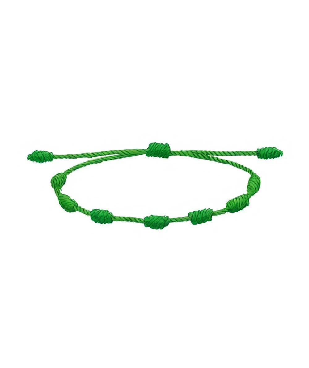 Pulsera de los 7 nudos en color verde. Utilízala en tu mano izquierda como amuleto de la buena suerte y como pulsera de protección contra malas energías y el mal de ojo. Como regalo espiritual se dice que estrecha lazos afectivos. Puedes usarla sin adornos o bien colocar un colgante para rematarla.