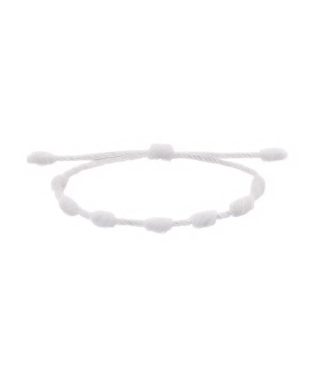 Pulsera de los 7 nudos en color blanco. Utilízala en tu mano izquierda como amuleto de la buena suerte y como pulsera de protección contra malas energías y el mal de ojo. Como regalo espiritual se dice que estrecha lazos afectivos. Puedes usarla sin adornos o bien colocar un colgante para rematarla.