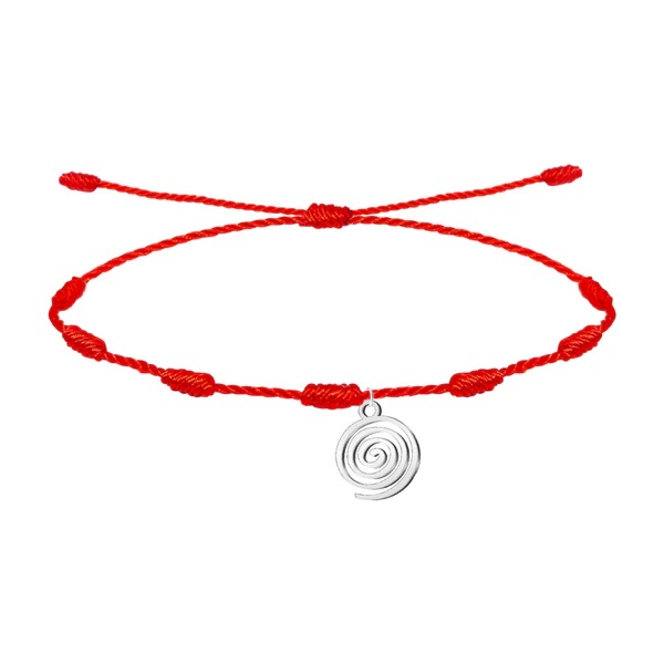 Pulsera 7 Nudos roja con Pintadera Canaria, espiral, Acero Plateado