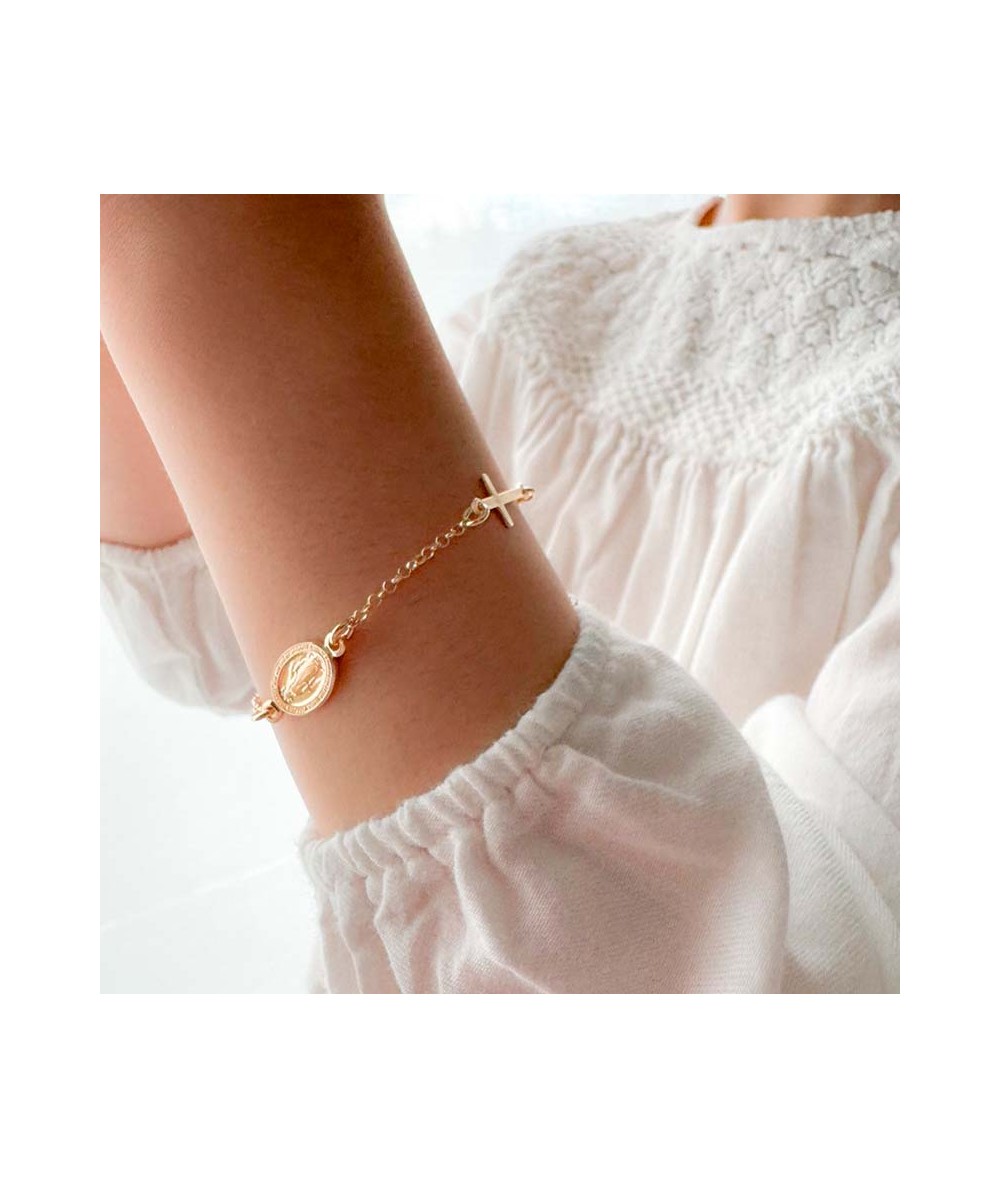 Pulsera infantil con Virgen Milagrosa y cruz en Plata 925 chapado en Oro 0.5 micras