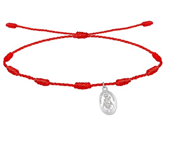 Pulsera 7 nudos rojo con medalla Virgen de Covadonga, Acero Plateado