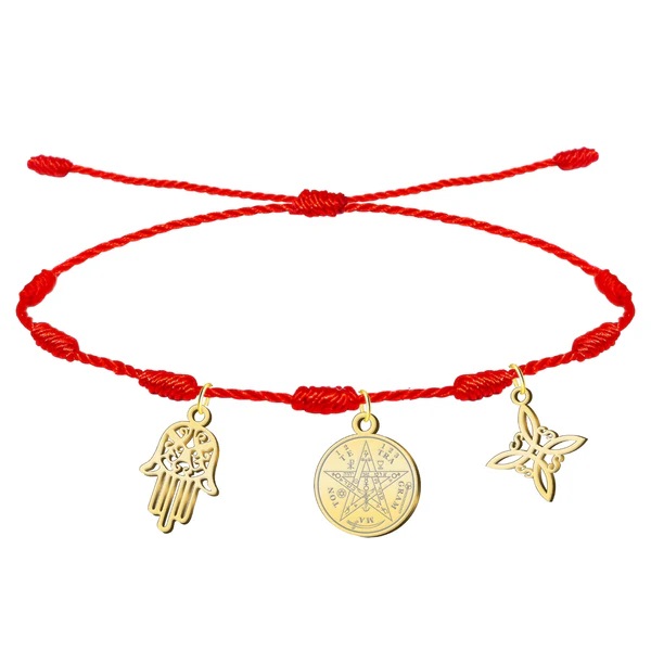 Pulsera 7 nudos con Nudo de Bruja, Tetragramatón y Mano Fátima Acero Inoxidable Dorado