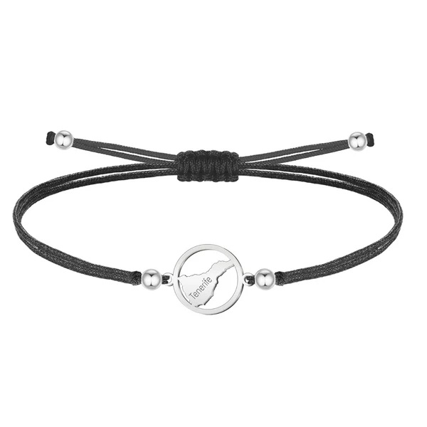 Pulsera poliéster encerado negro, Mapa Isla de Tenerife, Acero plateado