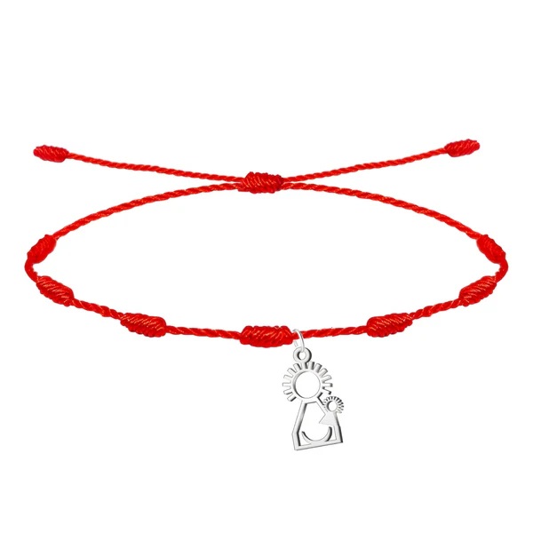 Pulsera 7 nudos rojo con silueta de la Virgen del Pino, Acero plateado